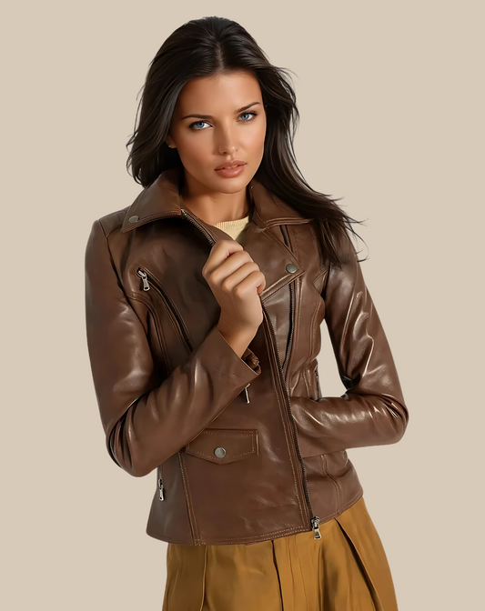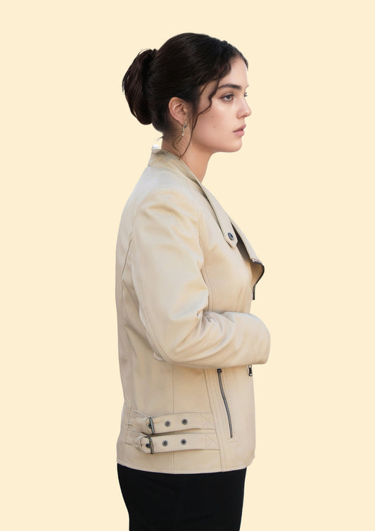 Introducing the Annelise Veldt, a genuine leather women's moto jacket that exemplifies refined European elegance with a modern edge. Crafted from premium leather, its soft cream hue brings a versatile and timeless appeal perfect for elevating any wardrobe. The jacket’s design seamlessly balances sophistication with an urban spirit, making it an essential statement piece for the discerning wearer.