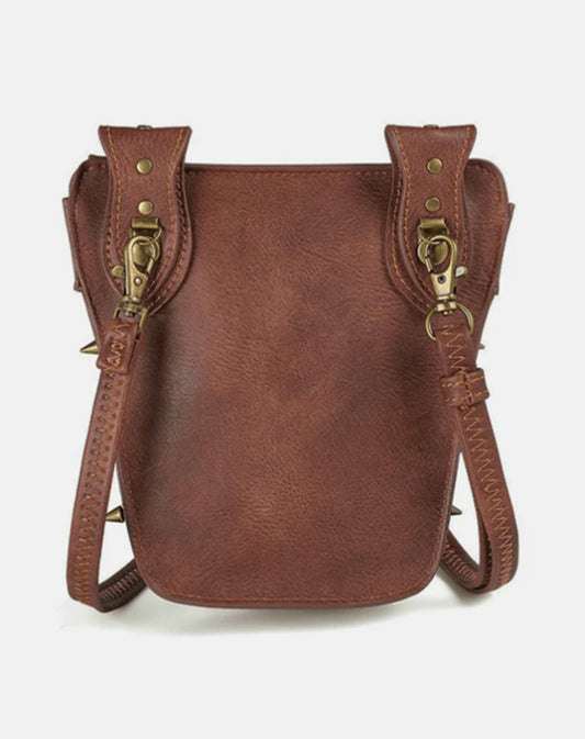 Turn every outing into an adventure with the Léonard crossbody! Rich brown faux leather, ornate metalwork, and edgy spike details infuse this bag with bold steampunk vibes. Designed for utility and standout style