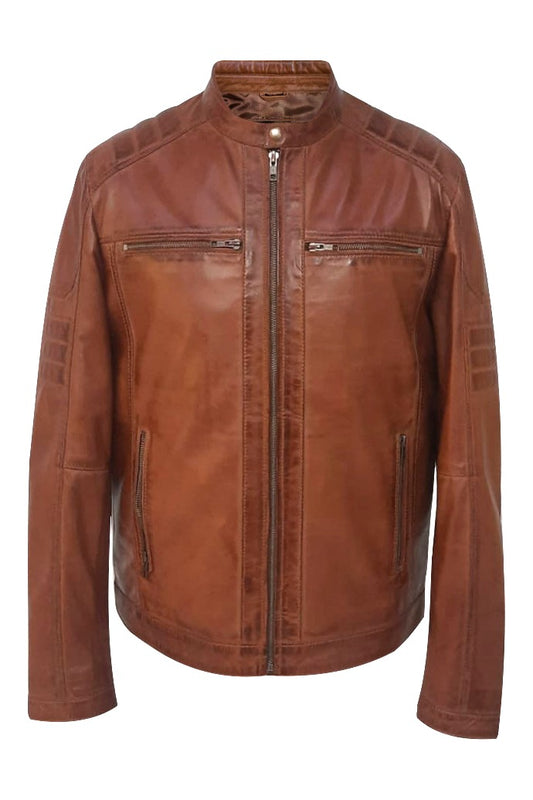 Lucien - Light Cognac Moto Leather Jacket channels vintage spirit and modern edge in rich chestnut brown leather. Defined by its stand collar, quilted shoulder accents, and robust zip pockets, Lucien is built for style and adventure