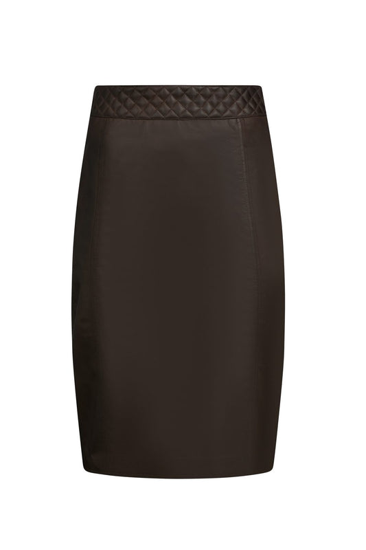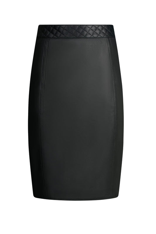 Sophisticated and timeless, the Noir Skirt features real leather, a refined diamond-quilted waistband, and a sleek front slit for modern edge. Its tailored silhouette flatters and moves seamlessly from workday power to evening chic