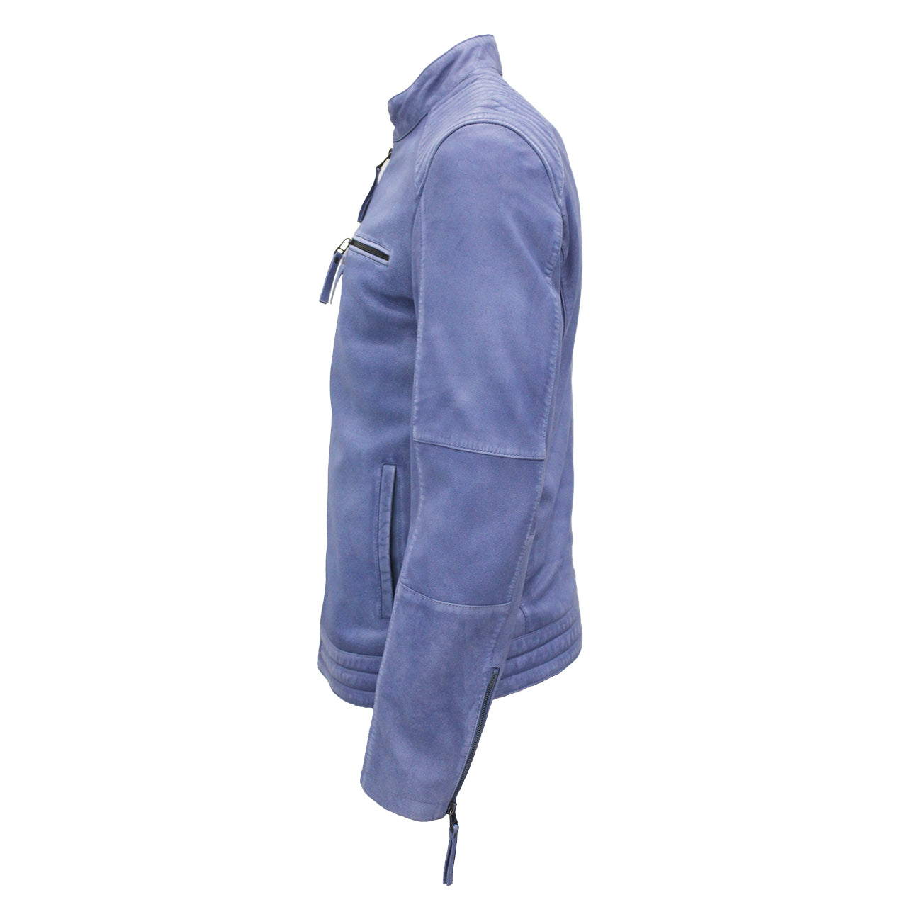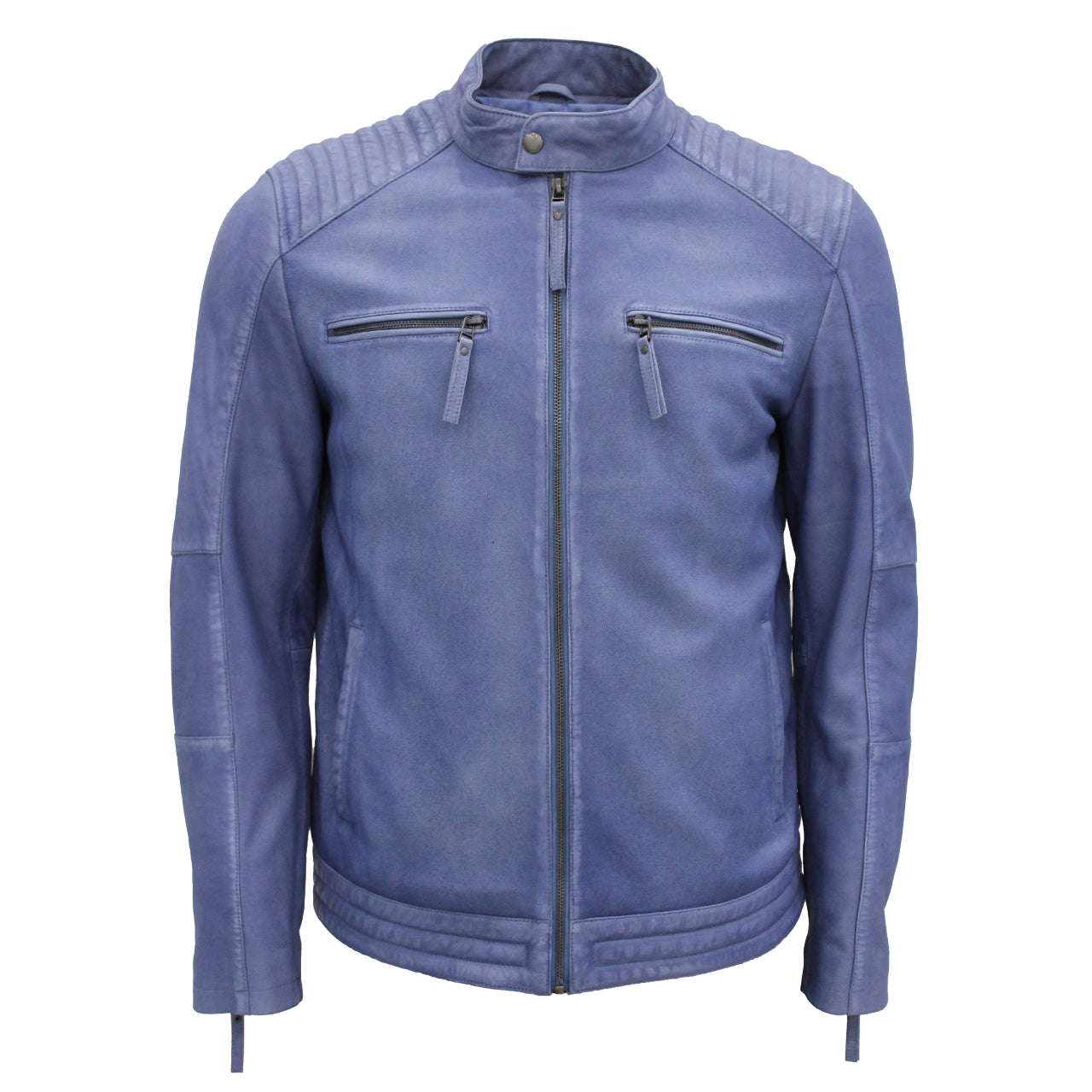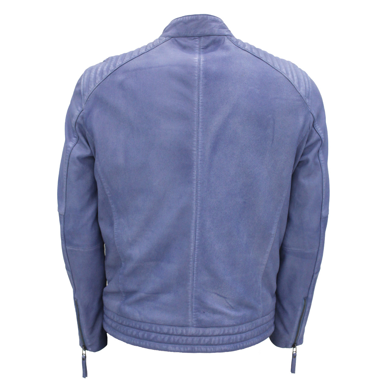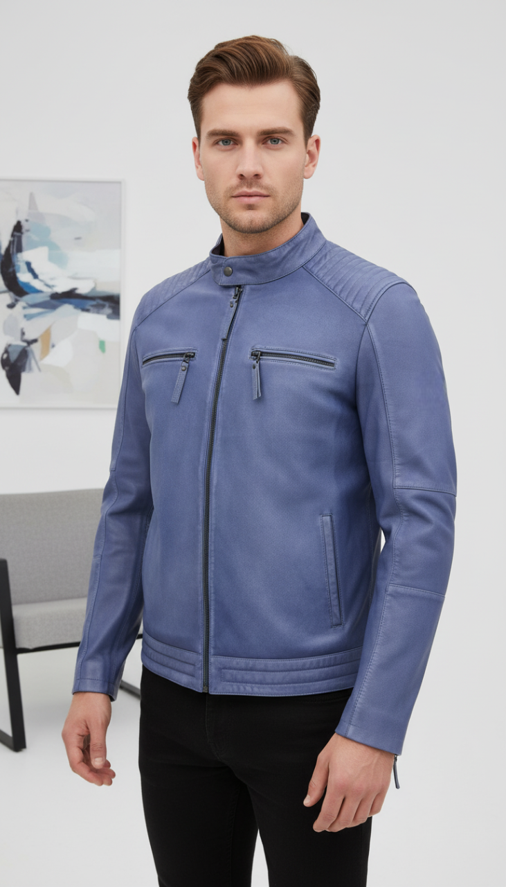 The Blaise jacket commands attention with its striking blue genuine leather construction, delivering a bold statement piece for the contemporary wardrobe. Precision-engineered quilting across the shoulders adds dimensional texture and refined structure, while functional chest zip pockets provide practical sophistication. The commanding stand collar frames the neckline with understated edge, creating a streamlined silhouette that flatters without compromise