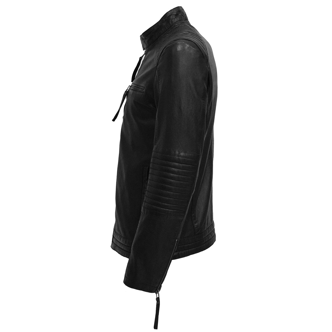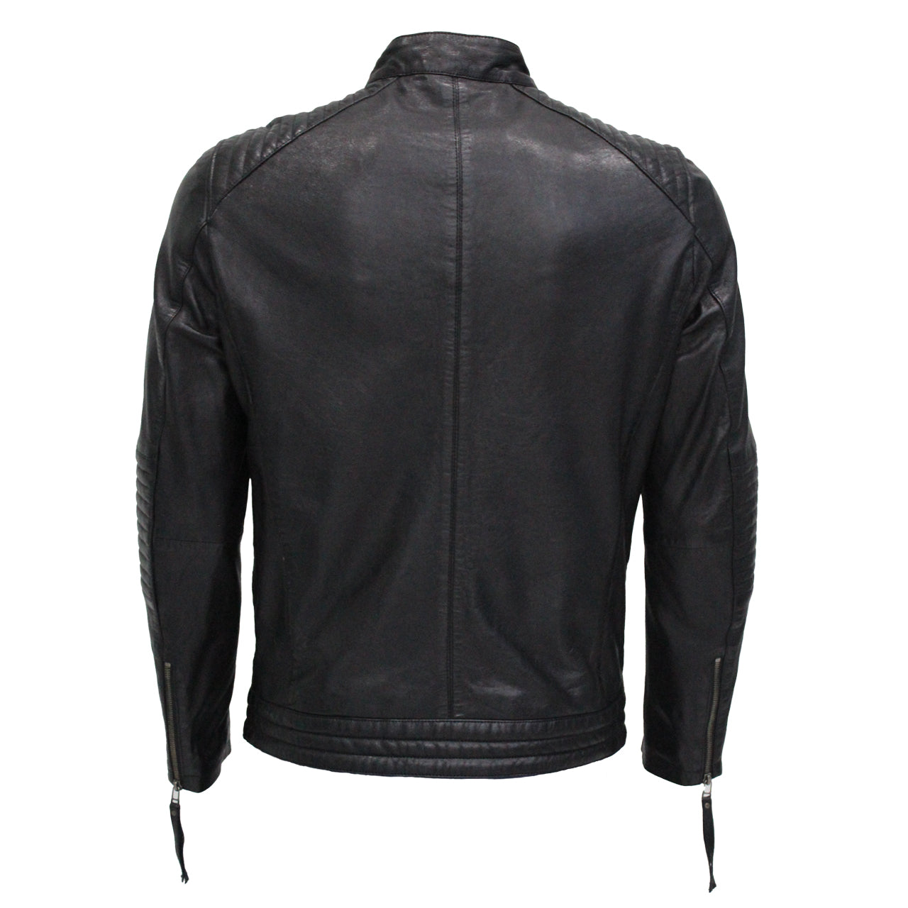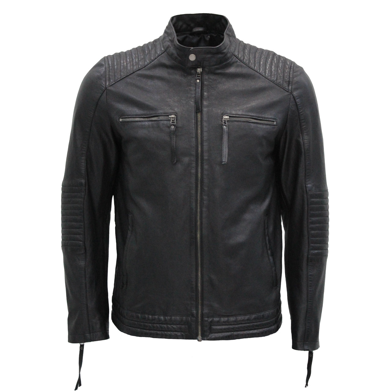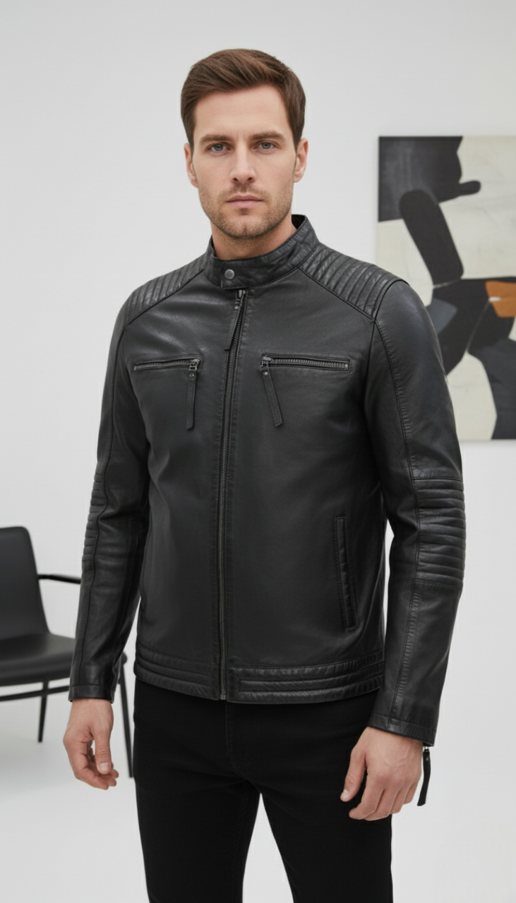 The Thierry commands attention with its refined minimalism. Crafted from genuine jet black leather, this men's jacket balances understated elegance with purposeful design. Quilted detailing across the shoulders and sleeves adds textural sophistication while reinforcing structural integrity. The streamlined silhouette flatters without excess, while functional zip pockets deliver practical utility
