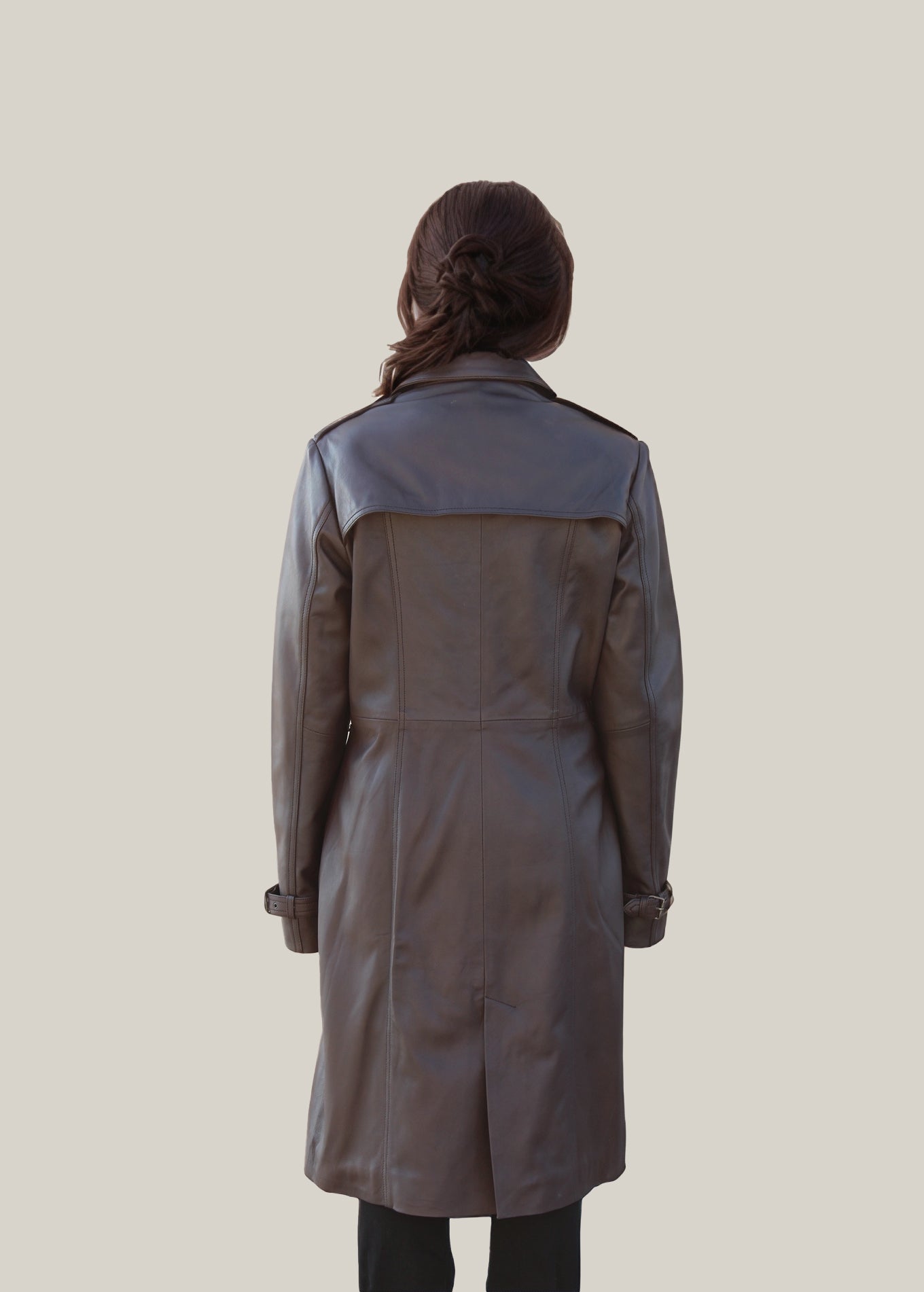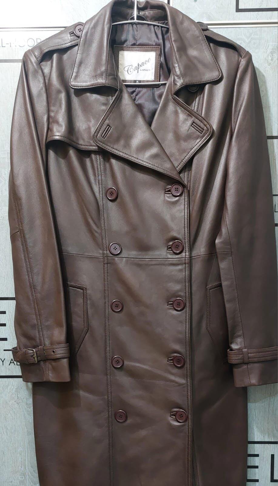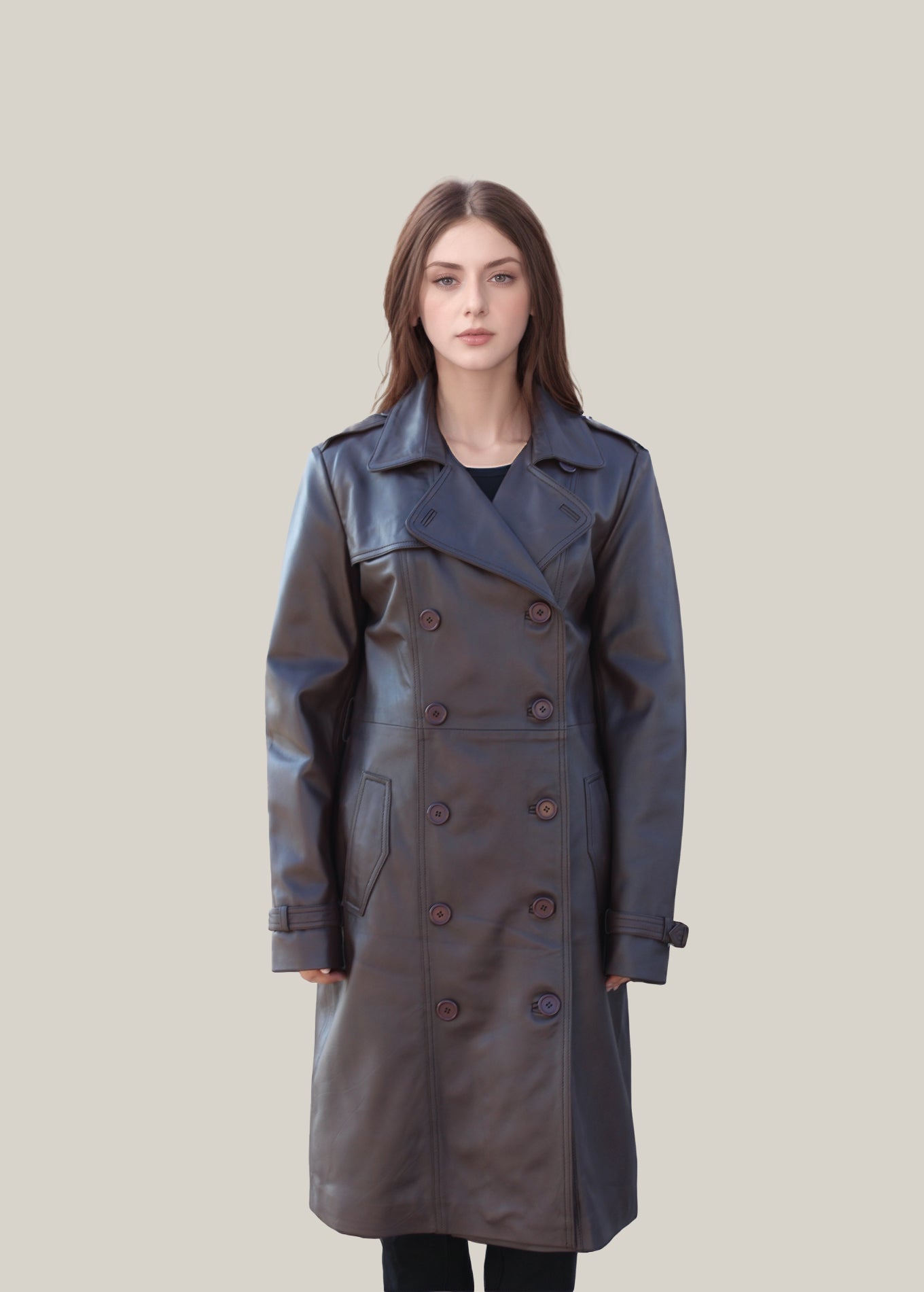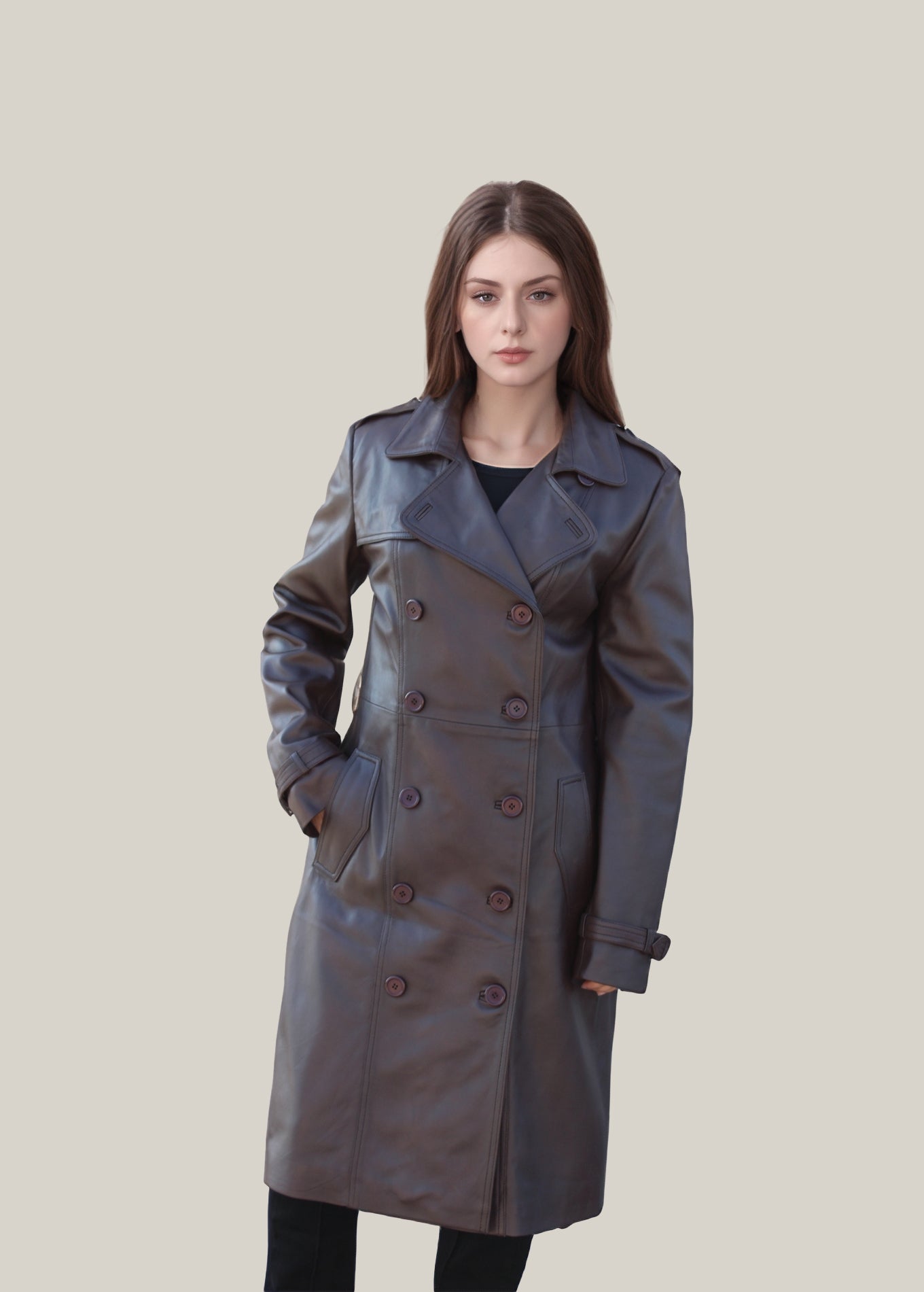 The Evelyn Noir trench coat combines premium craftsmanship with contemporary style. Made from genuine leather, it features a sleek double-breasted button closure that adds a modern edge to its classic silhouette. Practical flap pockets provide convenient storage, while the smooth inner lining ensures comfort throughout the day. This coat is a refined choice for those seeking both elegance and functionality.