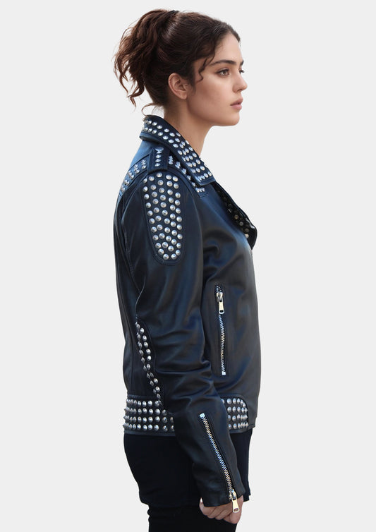 The Vivienne Riot leather jacket makes a powerful statement with its bold silver studding meticulously placed across the lapels, shoulders, and hem. These striking embellishments transform the classic black leather into a captivating piece that instantly upgrades any outfit, adding a rebellious yet refined edge to your wardrobe. Built with timeless moto details, the jacket features an asymmetrical zipper that enhances its dynamic silhouette and offers versatile wearability. Its expertly tailored design ensures both comfort and a flattering fit, while the durable leather guarantees longevity and lasting style.