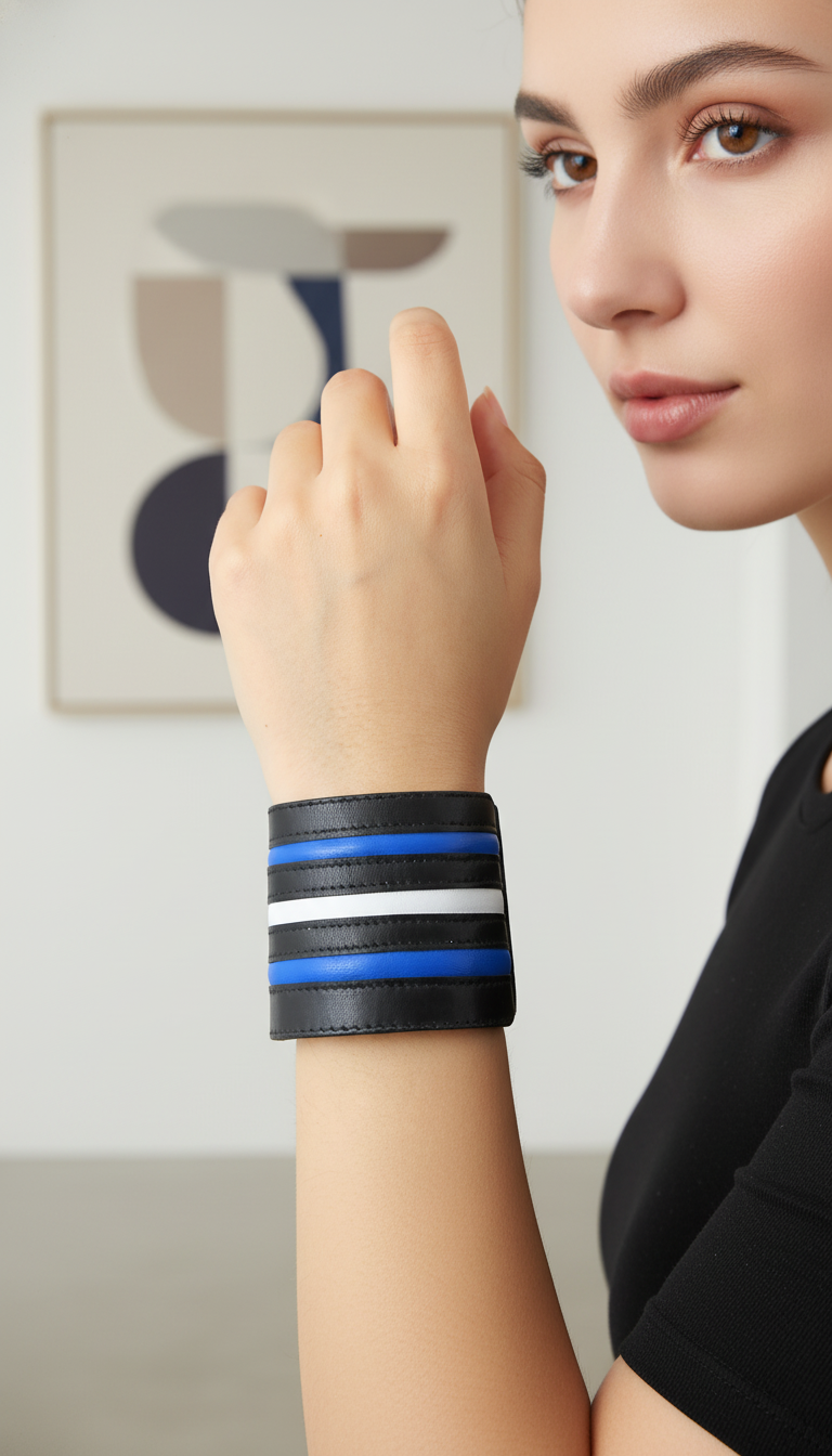 The Gerhardt redefines everyday carry with its striking design and functional sophistication. Crafted from premium black leather, this wallet cuff features bold horizontal stripes in vibrant white, and blue. A contemporary take on classic color blocking. The integrated zip pocket securely holds cash and cards, while a reliable snap closure keeps everything in place